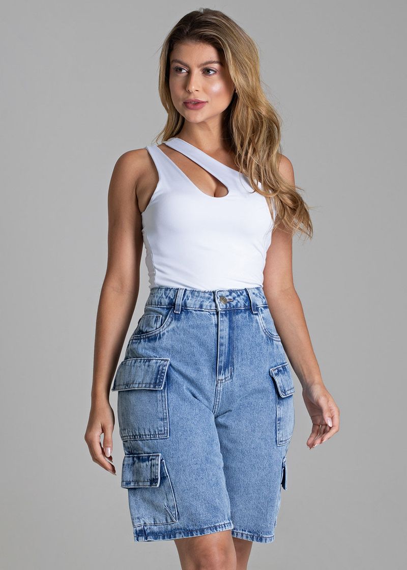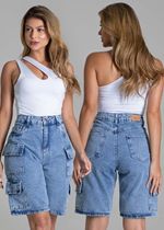Bermuda confeccionado em jeans cargo . Modelagem moderna e confortável para todas as ocasiões. Cintura alta Fechamento com botão e zíper Bolsos frontais falsos e lateral cargo e traseiro funcionais Barra simples Tecido: Jeans Tipo de lavagem: azul Cor: azul