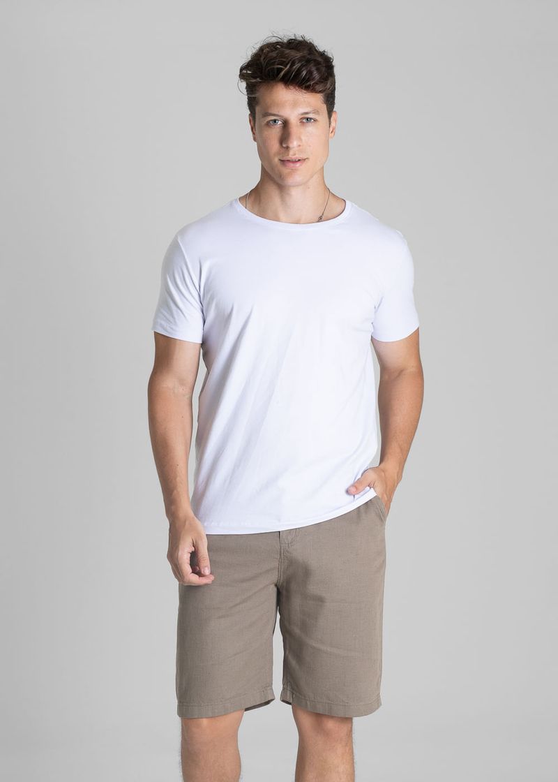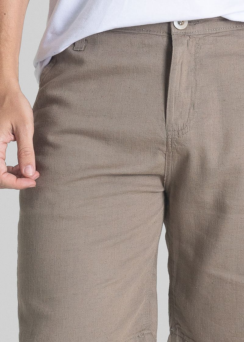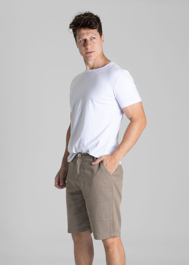 Bermuda masculino confeccionada em linho. Modelagem diversas e comprimento médio. Cintura média Comprimento médio Fechamento com botão e zíper Bolsos frontais e e traseiros funcionais Barra simples Modelagem: Men bermuda Tecido: linho Cor: caqui
