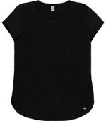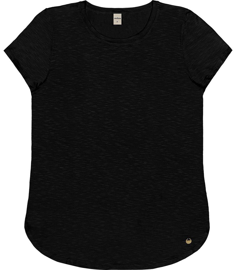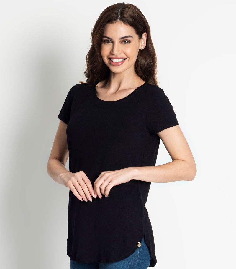 Blusa Feminina Alongada Básica. Desenvolvida na malha viscose flamê com plaquinha de metal decorativa na barra. Os básicos são itens essenciais no guarda-roupa, vão bem para qualquer ocasião, aposte!