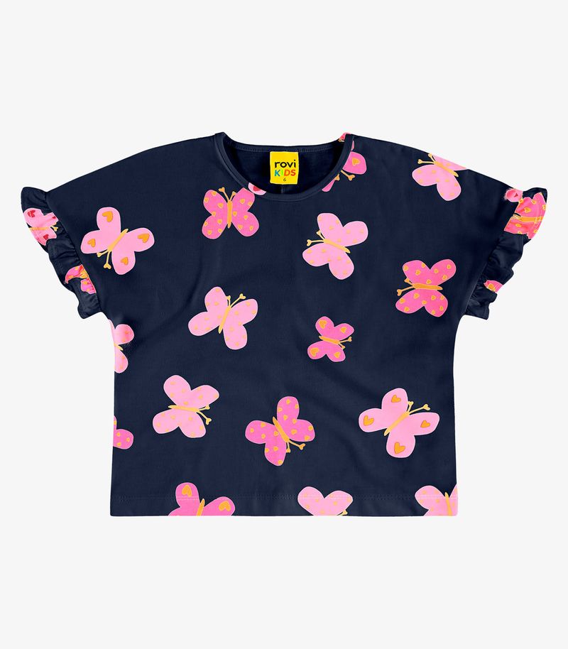 Blusa infantil feminina confeccionada em meia malha, leve e confortável para o dia a dia. Possui estampa rotativa divertida e colorida. O decote tem acabamento com friso, garantindo melhor caimento. Destaque para os babados franzidos nas mangas, que dão um toque delicado e charmoso à peça. A barra tem acabamento com costura dupla para maior durabilidade e um visual bem acabado. Ideal para compor looks fresquinhos e alegres.