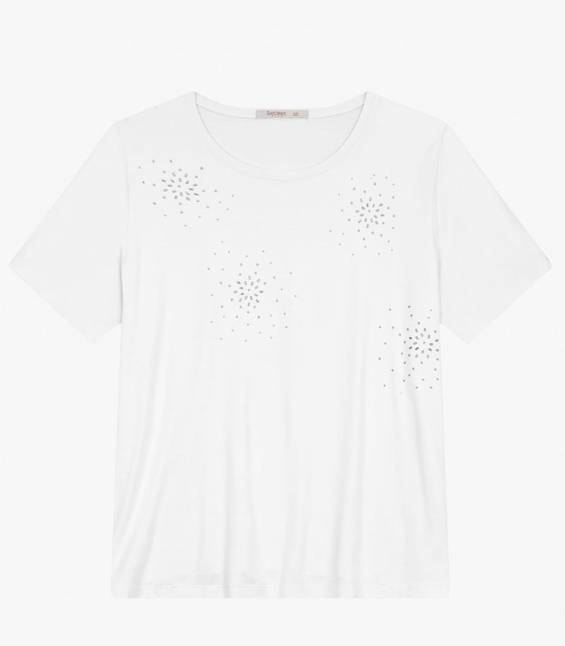 Blusa manga curta confeccionada em viscotorcion, leve e confortável. Possui gola com friso e pesponto decorativo, aplicação de termocolante na parte frontal que traz brilho e charme à peça. As mangas e a barra contam com acabamento em bainha reforçada com costuras duplas, garantindo durabilidade e um visual bem acabado. Ideal para compor looks casuais com estilo e praticidade.