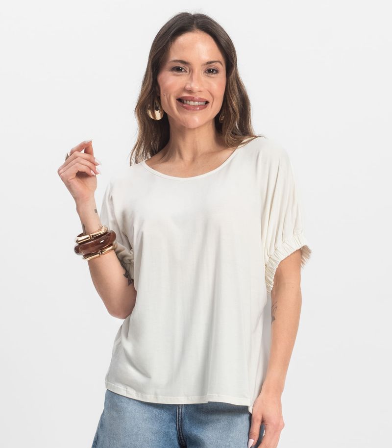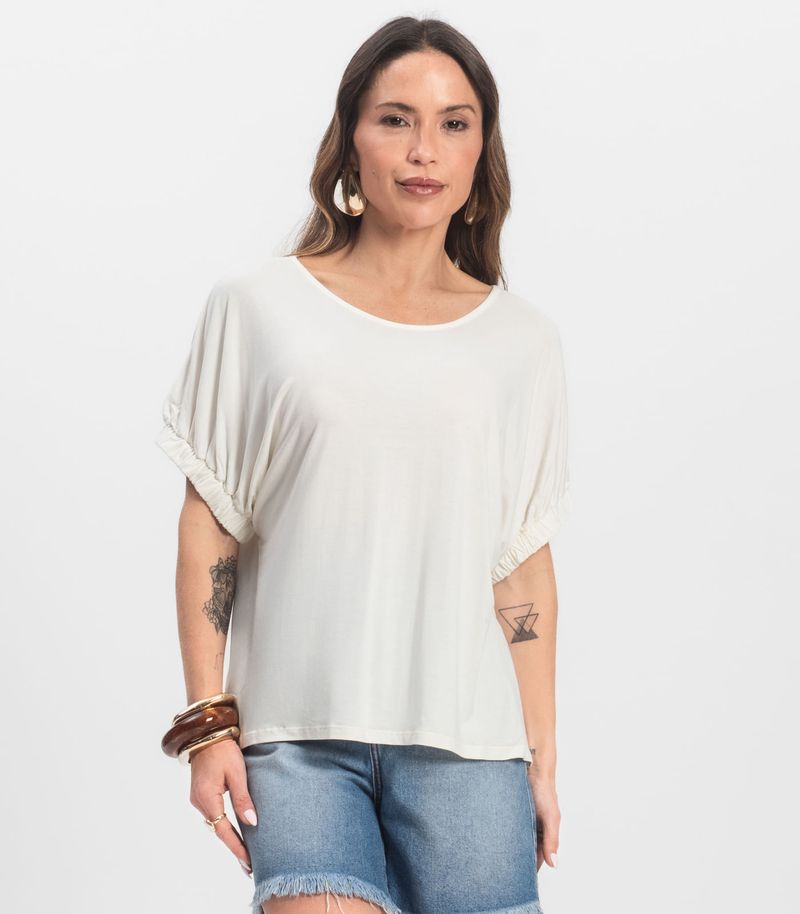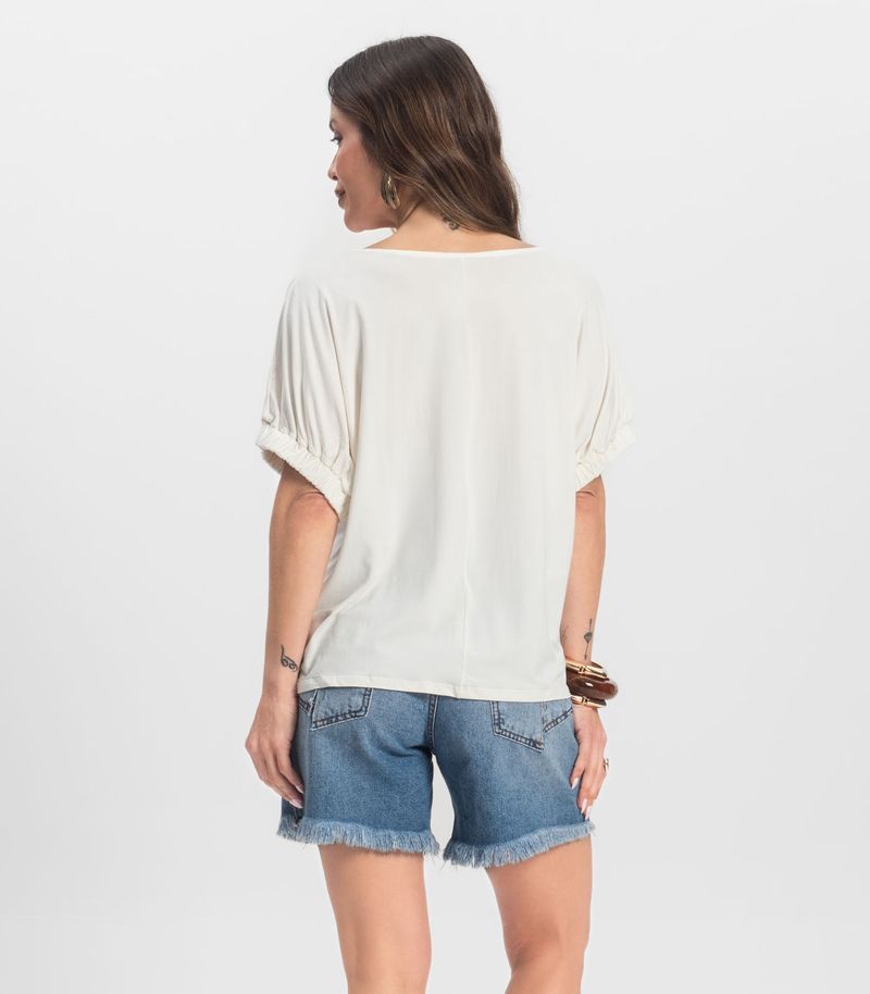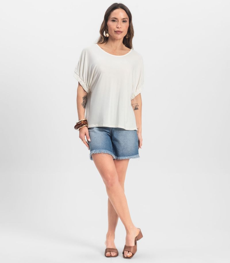 Blusa feminina Infinita Cor confeccionada em malha de viscose, ideal para o dia a dia e ocasiões casuais. Possui decote redondo com friso, mangas curtas com punho franzido por elástico e acabamento da barra com bainha dupla. Leve, confortável e com ótimo caimento, é uma peça versátil que une estilo e praticidade para compor looks modernos e descomplicados.
