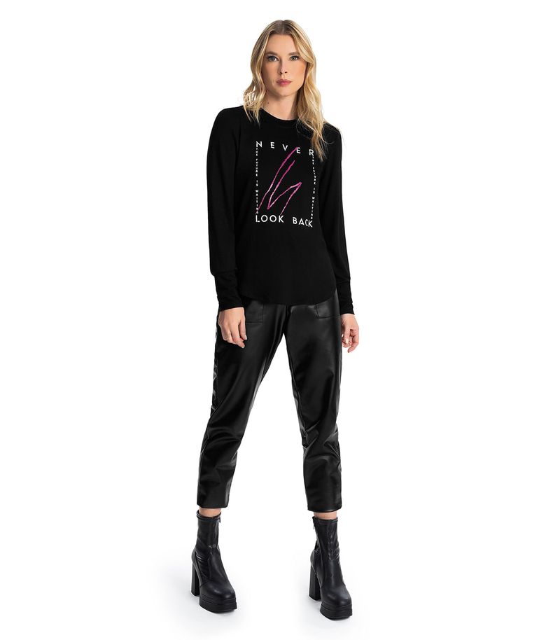 O Blusão Feminino Rovitex é confeccionado em Molecotton de Viscose e Ribana de Viscose, possui decote redondo, manga longa com punhos na barra e estampa localizada frontal com detalhes em aplique de esferas e foil.