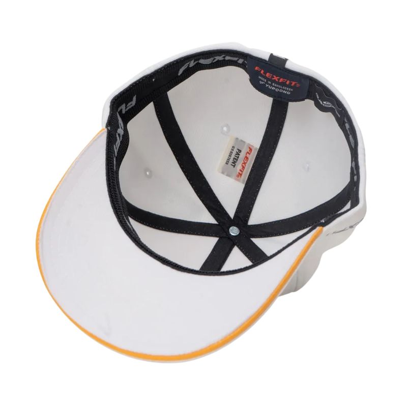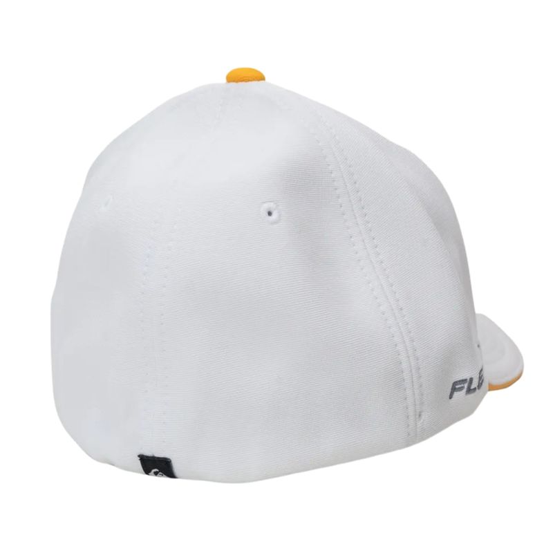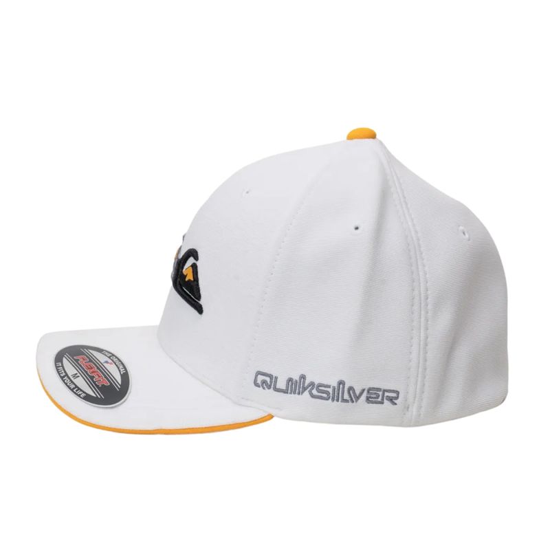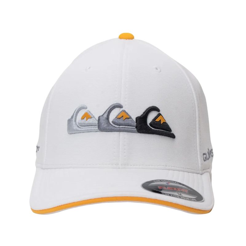 Boné QuikSilver feito em modelagem 6painel Flexfit, faixa anti suor por toda a circunferência interna, bordado 3 logos em degradê com transfer contrastante aplicado no painel frontal, bordado FLEXFIT aplicado ao longo da lateral direita, aplicação de etiqueta na barra traseira e aba interna lisa contrastante.