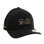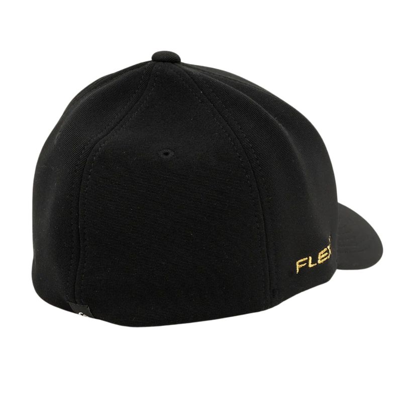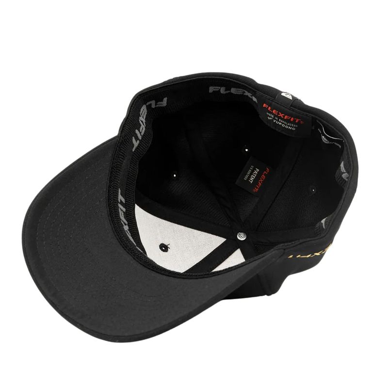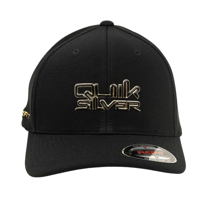 Boné QuikSilver feito em modelagem 6painel Flexfit, faixa anti suor por toda a circunferência interna, assinatura broken contornada em uretano dourado solado centralizado no painel frontal, aba interna lisa, bordado FLEXFIT aplicado ao longo da lateral direita e etiqueta localizada na barra traseira.