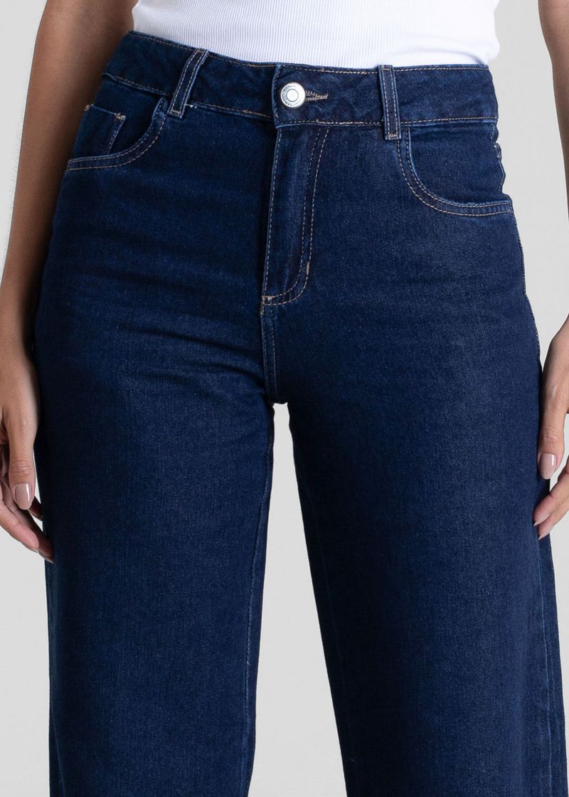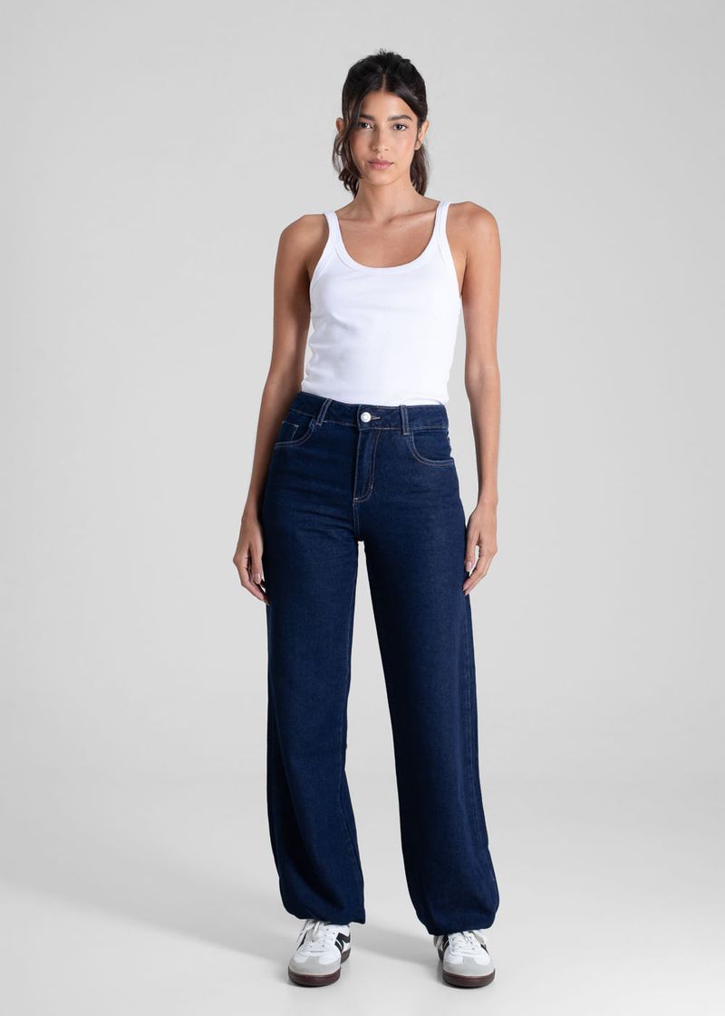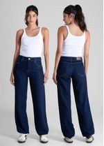 Calça feminina confeccionada em jeans. A calça balonê é um modelo caracterizado pelo volume arredondado concentrado na região das pernas, criando uma silhueta ampla e estruturada, que lembra um balão. Cintura alta Fechamento com botão e zíper Bolsos frontais e bolsos traseiros funcionais Barra com elástico Tecido: Jeans Tipo de lavagem: Azul Cor: Azul escuro