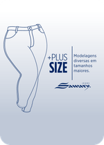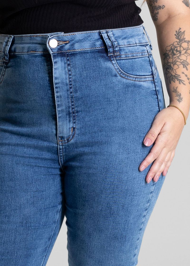 Calça plus size confeccionada em jeans. A modelagem cigarrete, sendo ajustado ao corpo até a altura do tornozelo. Cintura alta Fechamento com botão metálico e zíper Bolsos frontais falsos e bolsos traseiros funcionais Barra simples Modelagem: cigarrete Tecido: Jeans Tipo de lavagem: Azul Cor: Azul