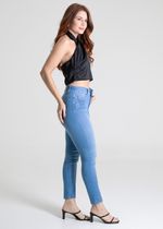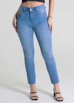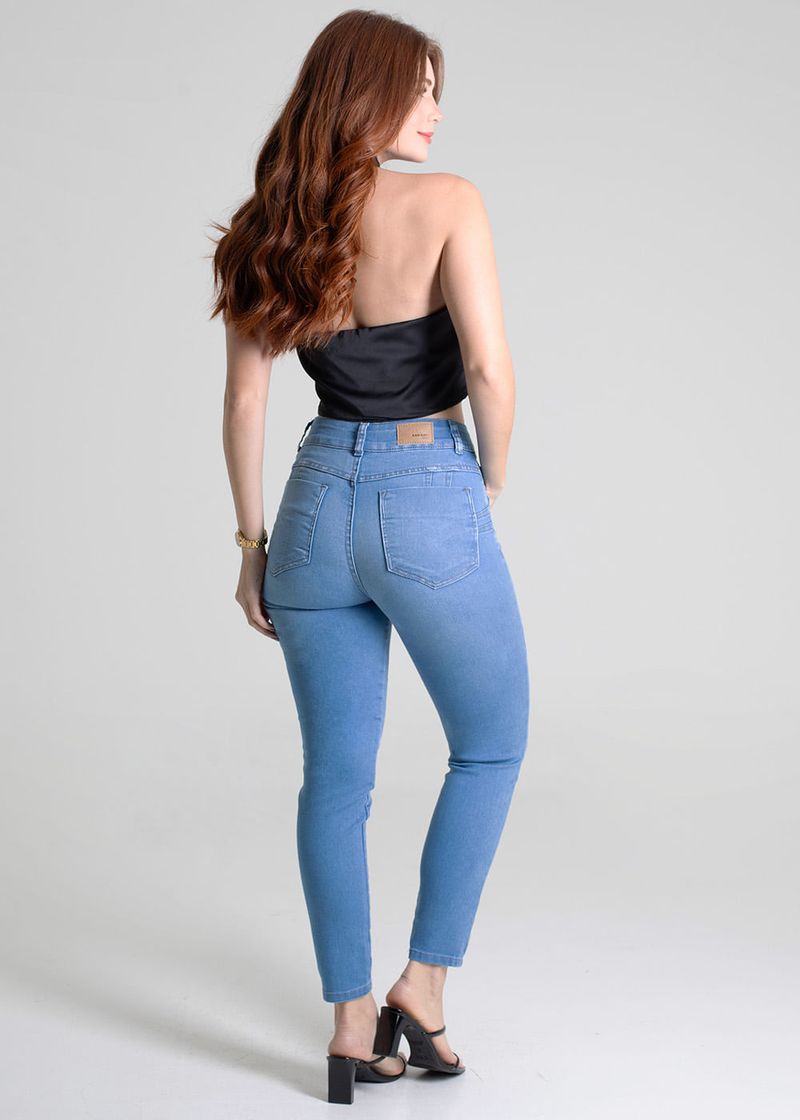 Calça levanta bumbum confeccionada em jeans. A modelagem tem quatro pences que valorizam as formas. Cintura médio Fechamento com botão metálico e zíper Bolsos frontais falsos e bolsos traseiros funcionais Barra simples Tecido: Jeans Tipo de lavagem: Azul Cor: Azul Claro