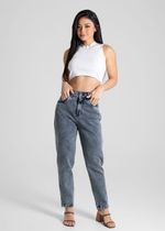 Calça mom confeccionada em jeans. A modelagem mom tem um caimento soltinho nos quadris e coxas ajustando até o tornozelo. Cintura alta Fechamento com botão e zíper Bolsos frontais e bolsos traseiros funcionais Barra simples Modelagem: Mom Tecido: Jeans Tipo de lavagem: Azul Cor: Azul