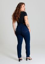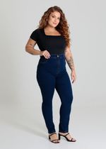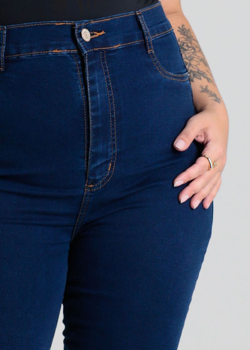 Calça plus size confeccionada em jeans. A modelagem cigarrete, sendo ajustado ao corpo até a altura do tornozelo. Cintura alta Fechamento com botão metálico e zíper Bolsos frontais falsos e bolsos traseiros funcionais Barra simples Modelagem: cigarrete Tecido: Jeans Tipo de lavagem: Azul Cor: Azul escuro
