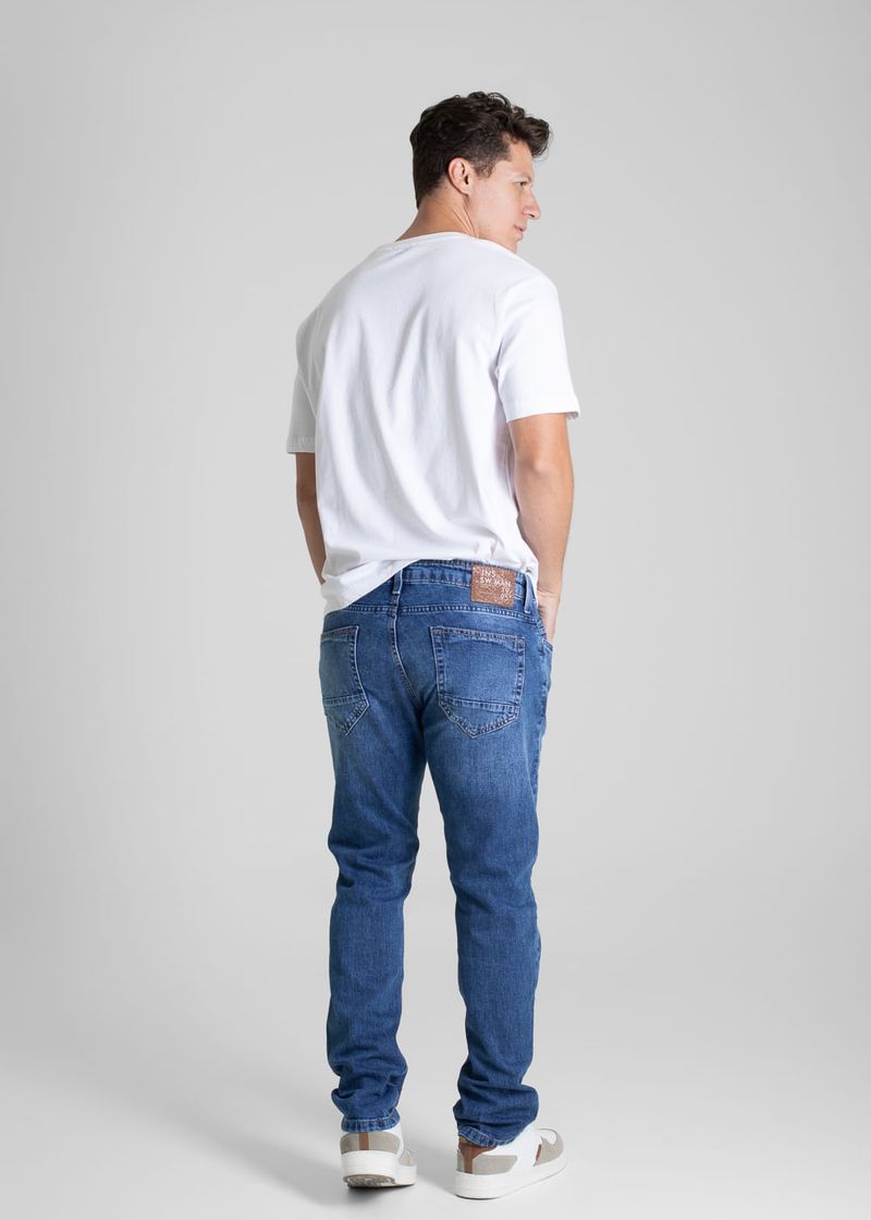 Calça confeccionada em jeans. Modelagem tem o caimento reto. Cintura média Fechamento com botão metálico e zíper Bolsos frontais e bolsos protetores Barra simples Modelagem: Reta Tecido: Jeans Tipo de lavagem: Azul Cor: Azul médio