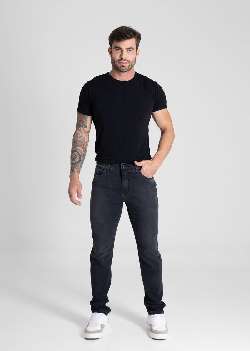 Calça preta skinny confeccionada em jeans. Modelagem ajustada até a barra. Cintura média Fechamento com botão metálico e zíper Bolsos frontais e bolsos traseiros funcionais Barra simples Modelagem: Men skinny Tecido: jeans Tipo de lavagem: Color Cor: Preto