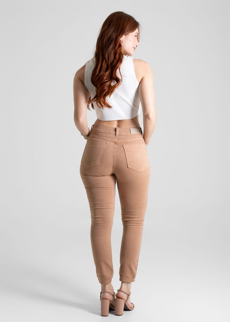 Calça feminina confeccionada em sarja O modelo é skinny petit, conforto e estilo, sem a necessidade de fazer a barra. Cintura alta Fechamento através de um botão e zíper Bolsos frontais falsos e posteriores funcionais Barra simples Tecido: sarja Tipo de Lavagem: Color Cor: marrom