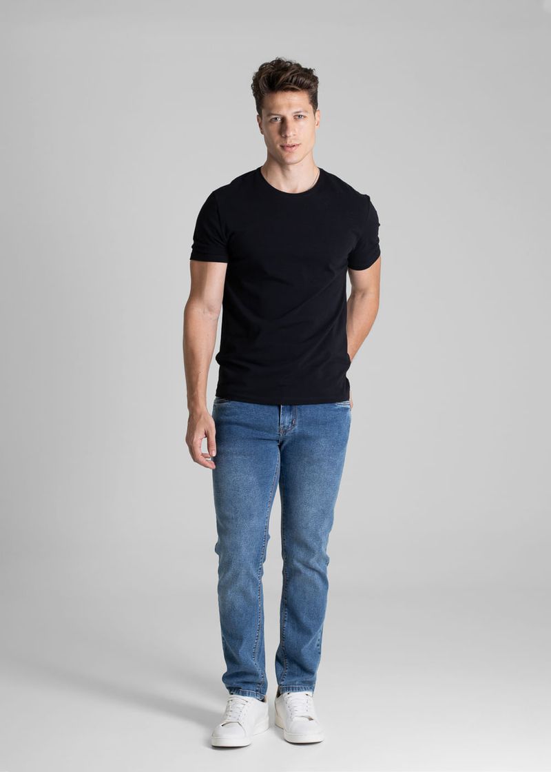 Calça slim confeccionada em jeans. Modelagem ajustada até a barra. Cintura média Fechamento com botão metálico e zíper Bolsos frontais e bolsos protetores Barra simples Modelagem: Men slim Tecido: Jeans Tipo de lavagem: Azul Cor: Azul médio