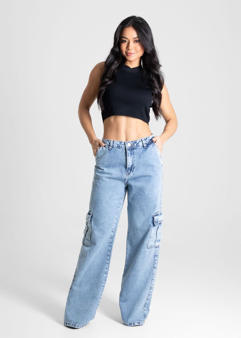 Calça feminina confeccionada em jeans. O modelo possui cintura super alta, gancho no lugar e caimento amplo da coxa até a barra. Cintura alta Fechamento através de um botão e zíper Bolsos frontais faca e posteriores funcionais bolsos cargo Barra simples Tecido: Jeans Tipo de Lavagem: Azul Cor: Azul medio