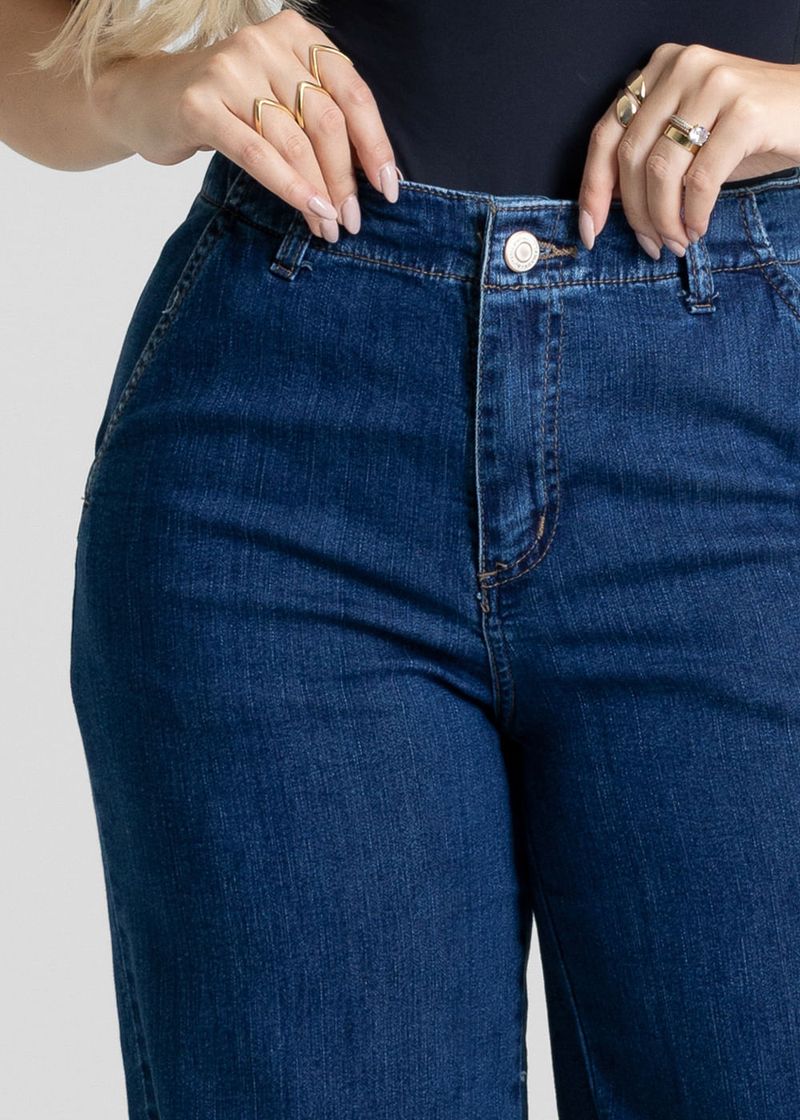 Calça feminina confeccionada em jeans. O modelo possui cintura super alta, gancho no lugar e caimento amplo da coxa até a barra. Cintura alta Fechamento através de um botão e zíper Bolsos frontais e posteriores funcionais Barra simples Tecido: Jeans Tipo de Lavagem: Azul Cor: Azul