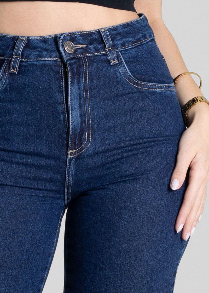 Calça feminina confeccionada em jeans. O modelo possui cintura super alta, gancho no lugar e caimento amplo da coxa até a barra. Cintura alta Fechamento através de um botão e zíper Bolsos frontais e posteriores funcionais Barra simples Tecido: Jeans Tipo de Lavagem: Azul Cor: Azul