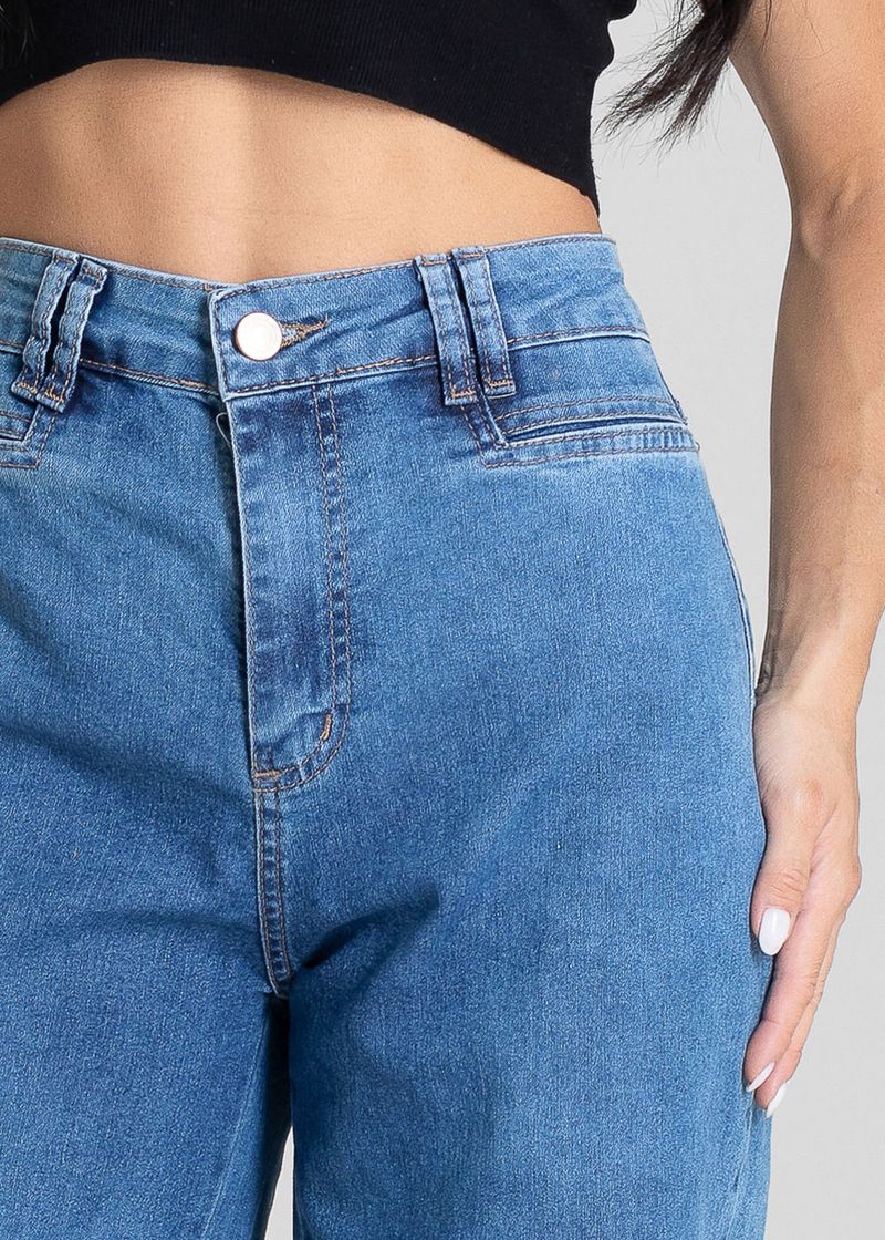 Calça feminina confeccionada em jeans. O modelo possui cintura super alta, gancho no lugar e caimento amplo da coxa até a barra. Cintura alta Fechamento através de um botão e zípe Bolsos frontais e posteriores funcionais Barra simples Tecido: Jeans Tipo de Lavagem: Azul Cor: Azul medio