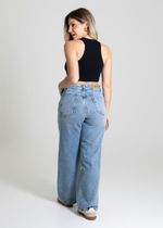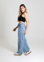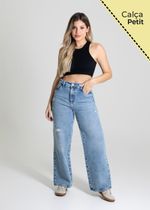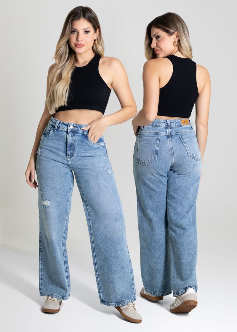 Calça feminina confeccionada em jeans. O modelo possui cintura super alta, gancho no lugar e caimento amplo da coxa até a barra. Cintura alta Fechamento através de um botão e zíper Bolsos frontais e posteriores funcionais Barra simples Tecido: Jeans Tipo de Lavagem: Azul Cor: Azul medio