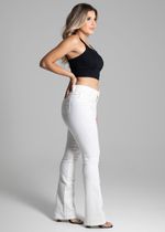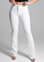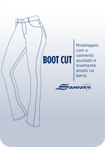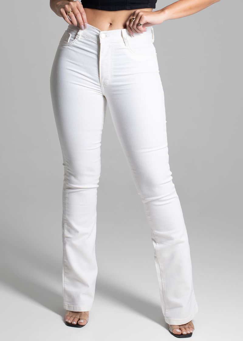 Calça sawary feminina confeccionada em sarja. A modelagem tem o caimento ajustado nas pernas e levemente ampla barra.