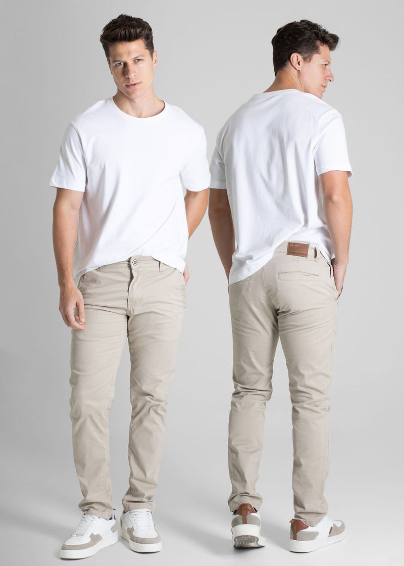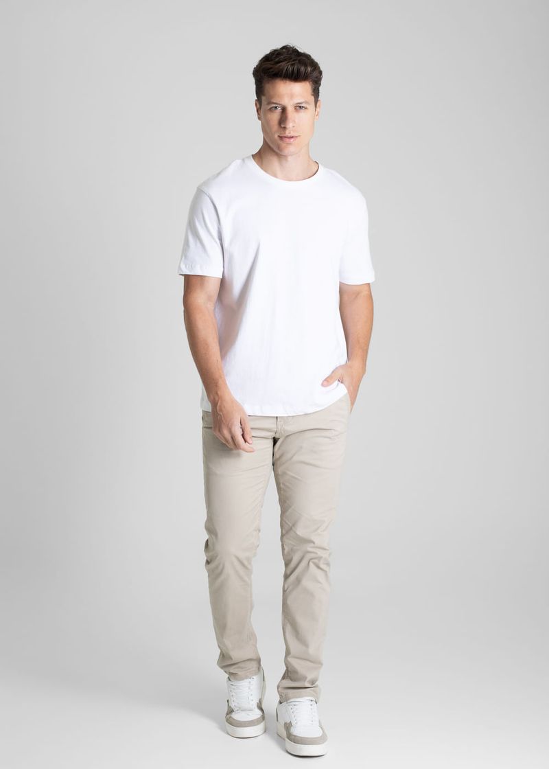 Calça slim confeccionada em jeans. Modelagem ajustada até a barra. Cintura média Fechamento com botão metálico e zíper Bolsos frontais faca e bolsos protetores Barra simples Modelagem: Men slim Tecido: Jeans Tipo de lavagem: color Cor: bege