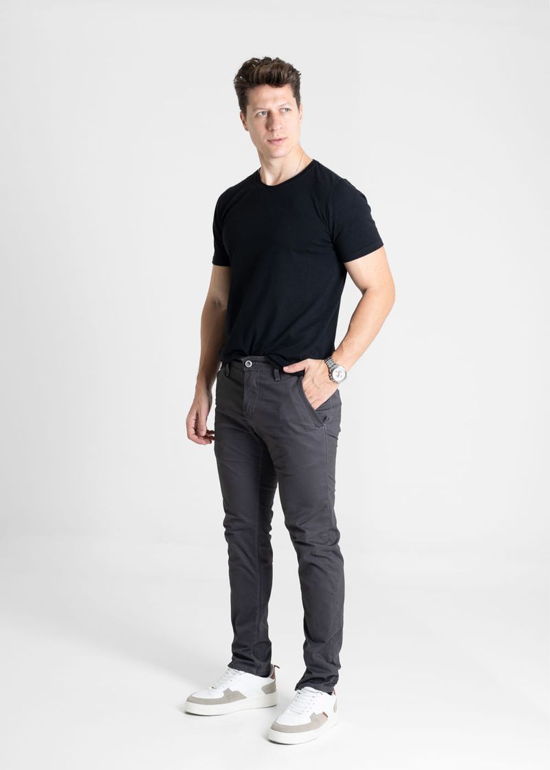 Calça slim confeccionada em sarja. A modelagem slim tem caimento levemente amplo no quadril e justo no comprimento. bolsos frontais e dois bolsos embutidos posteriores. Barra simples Modelagem: Men slim Tecido: Sarja Tipo de lavagem: Color Cor: Chumbo