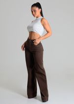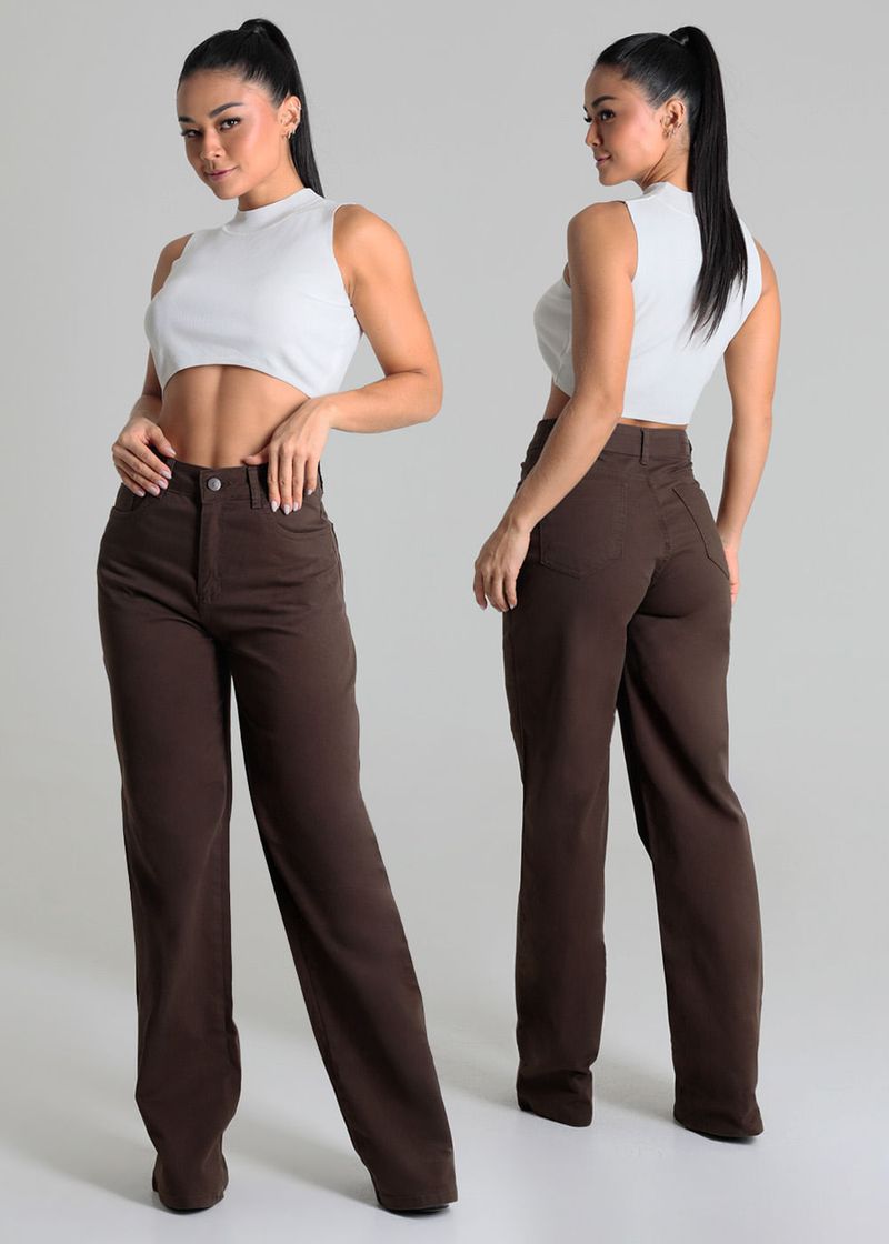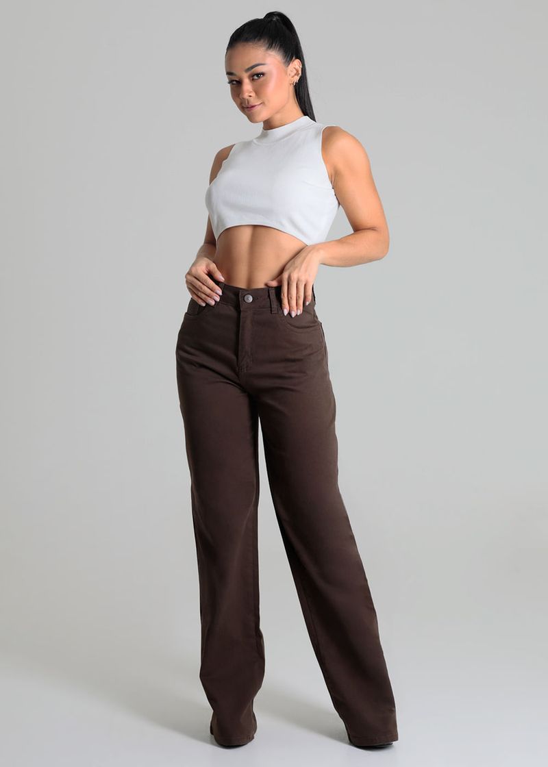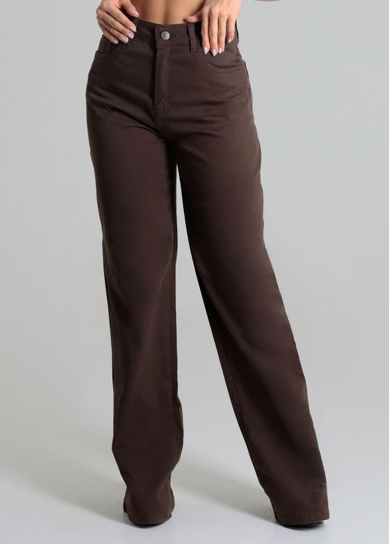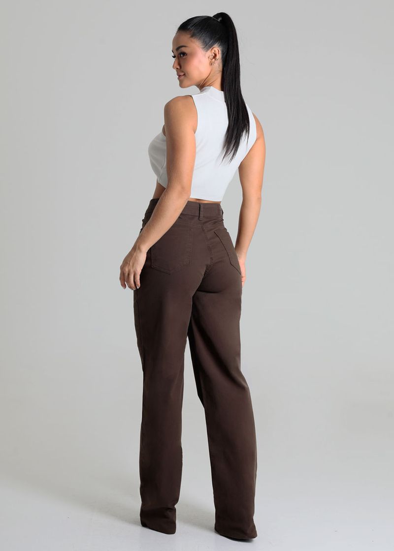 Calça feminina confeccionada em sarja. O modelo possui cintura super alta, gancho no lugar e caimento amplo da coxa até a barra. Cintura alta Fechamento através de um botão e zíper Bolsos frontais e posteriores funcionais Barra simples Tecido: Sarja Tipo de Lavagem: Color Cor: Marrom