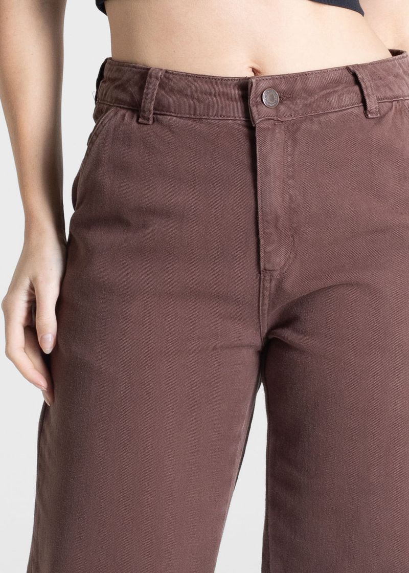 Calça feminina confeccionada em sarja. O modelo possui cintura super alta, gancho no lugar e caimento amplo da coxa até a barra. Cintura alta Fechamento através de um botão e zíper Bolsos frontais e posteriores funcionais Barra simples Tecido: Sarja Tipo de Lavagem: Color Cor: Marrom