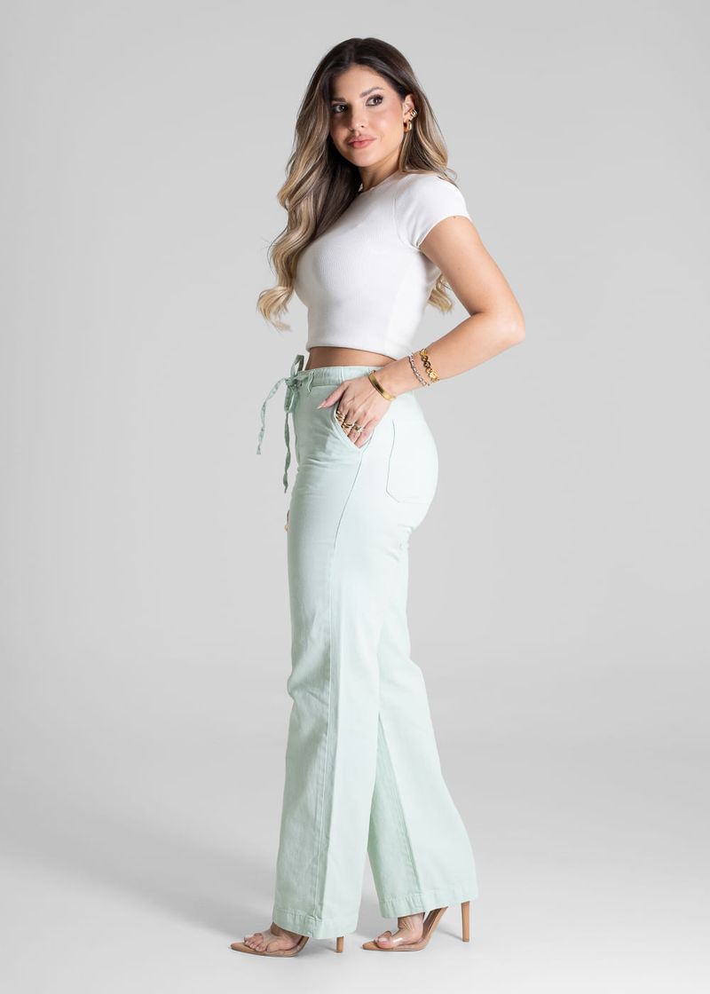 Calça feminina confeccionada em sarja. O modelo possui cintura super alta, gancho no lugar e caimento amplo da coxa até a barra. Cintura alta Fechamento através de um botão e zíper..cós acompanha cordão com o mesmo tecido para amarração Bolsos frontais e posteriores funcionais Barra simples Tecido: Sarja Tipo de Lavagem: Color Cor: Verde