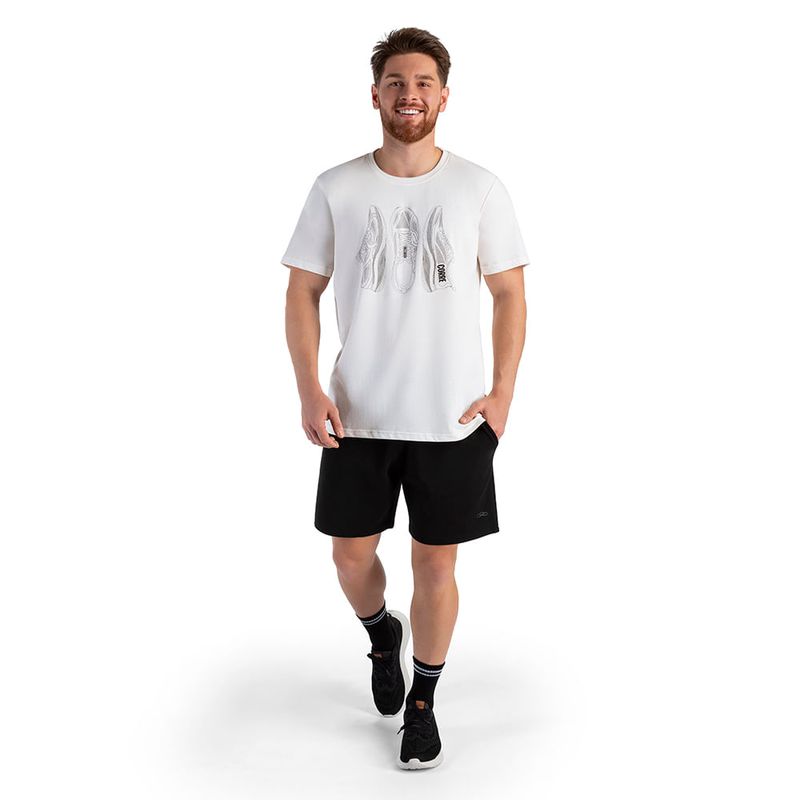 Conforto, estilo e um toque de diversão. Confeccionada em uma mistura de algodão com poliéster, oferece maciez, durabilidade e um caimento confortável. A modelagem unissex levemente slim garante versatilidade para diferentes corpos e ocasiões. A estampa inspirada nas silhuetas dos tênis adiciona um visual descontraído e original à peça. Perfeita para compor looks casuais com personalidade, sem abrir mão do conforto.