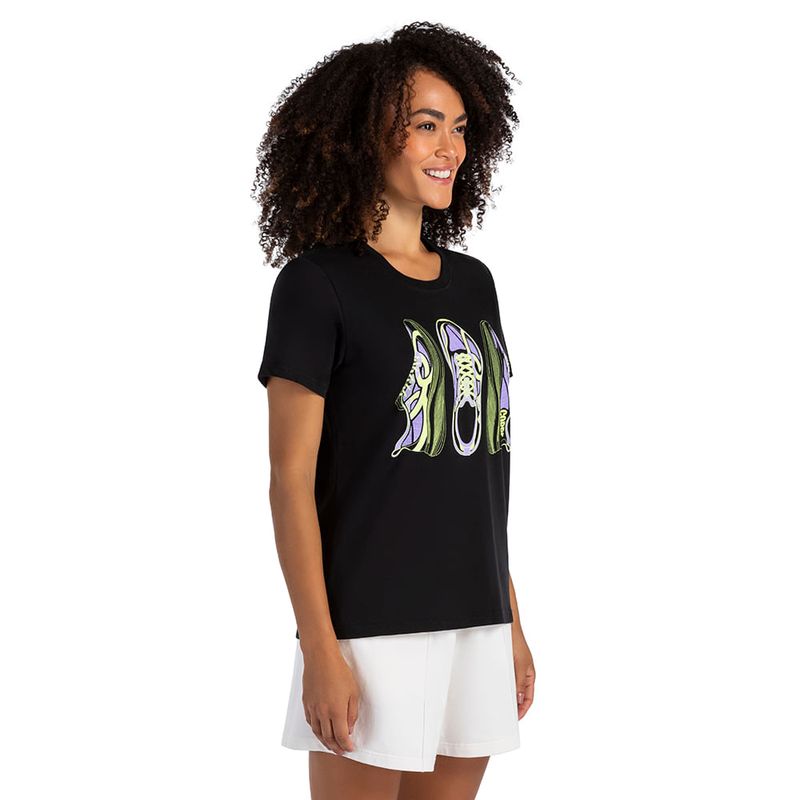 Conforto, estilo e um toque de diversão. Confeccionada em uma mistura de algodão com poliéster, oferece maciez, durabilidade e um caimento confortável. A modelagem unissex levemente slim garante versatilidade para diferentes corpos e ocasiões. A estampa inspirada nas silhuetas dos tênis adiciona um visual descontraído e original à peça. Perfeita para compor looks casuais com personalidade, sem abrir mão do conforto.