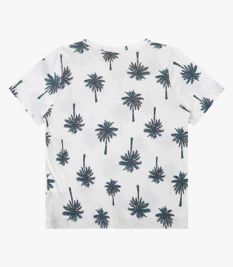 Camiseta Infantil Masculina confeccionada em Meia Malha macia e confortável, com estampa rotativa de coqueiros e elementos tropicais que dão um toque divertido ao visual. Possui gola redonda com acabamento em friso e mangas curtas com bainha e costura dupla, garantindo maior durabilidade. Ideal para passeios ao ar livre, combina perfeitamente com bermuda e tênis para um look leve e estiloso.