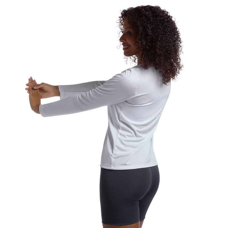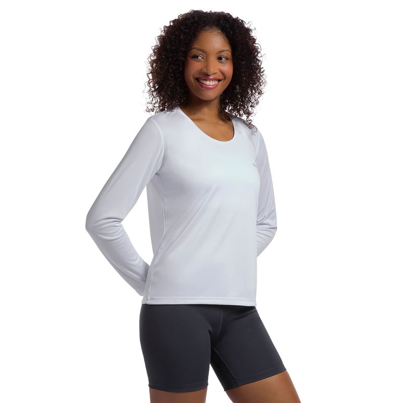 T-shirt manga longa feita de tecido leve, 100% poliéster, que não amassa e mantém seu corpo seco, além de protegido contra os raios UVA e UVB. Possui decote arredondado que mantém o colo protegido do sol e sua modelagem é levemente ajustada para uma sensação de conforto e liberdade. Conta ainda com mangas longas para uma maior cobertura do corpo e silk metálico em silicone, que acompanha o movimento de tecido. 100% Poliéster. Dry Action: Tecnologia que ajuda na absorção e eliminação do suor. É ideal para todo tipo de esporte, já que evita a aderência do tecido aocorpo, facilitando qualquer tipo de movimento. Solartech: Tecnologia desenvolvida para proteger o corpo dos raios UVA e UVB, que são nocivos à pele.