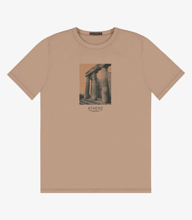 Camiseta Masculina Diametro confeccionada em meia malha, ideal para o dia a dia com muito conforto. Possui estampa localizada com imagem de colunas gregas e a palavra "ATHENS", trazendo um toque moderno e cultural ao visual. As mangas e a barra contam com acabamento em bainha com costura dupla, garantindo mais durabilidade e um ótimo caimento. Perfeita para compor looks casuais com estilo e personalidade.