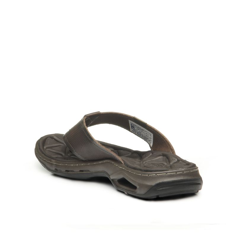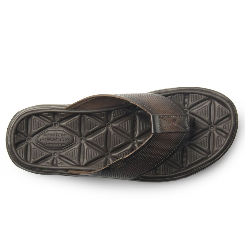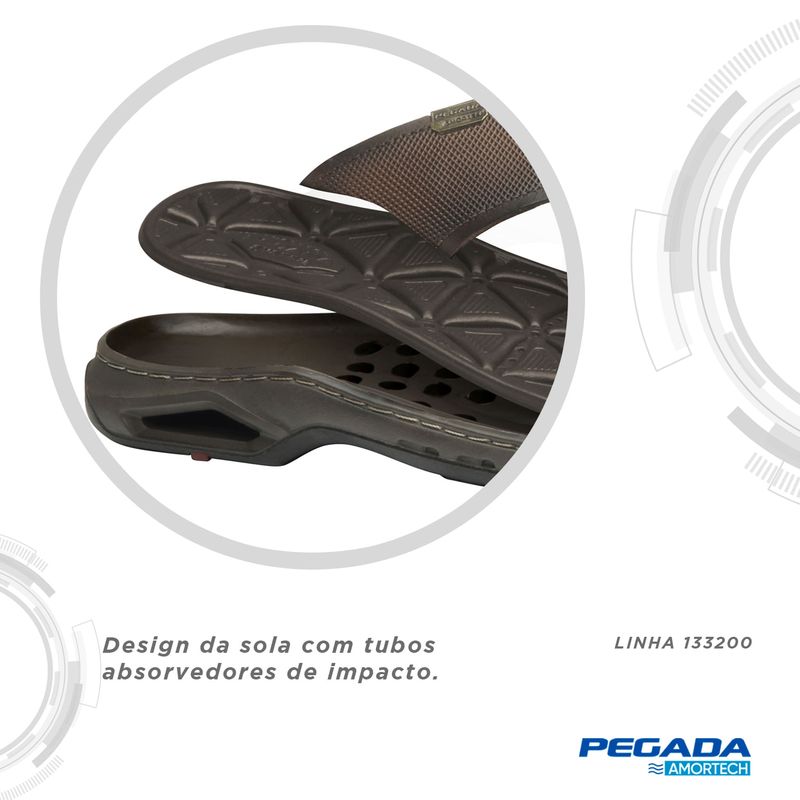 Esse chinelo é fabricado em couro, matéria prima de alta qualidade, resistência e durabilidade. O solado é leve e flexível, e conta ainda com o sistema de amortecimento AMORTECH, através de tubos que absorvem o impacto na regiao do calcanhar. A palmilha é anatômica feita em eva que se adapta ao formato do pé com massageadores triangulares.
