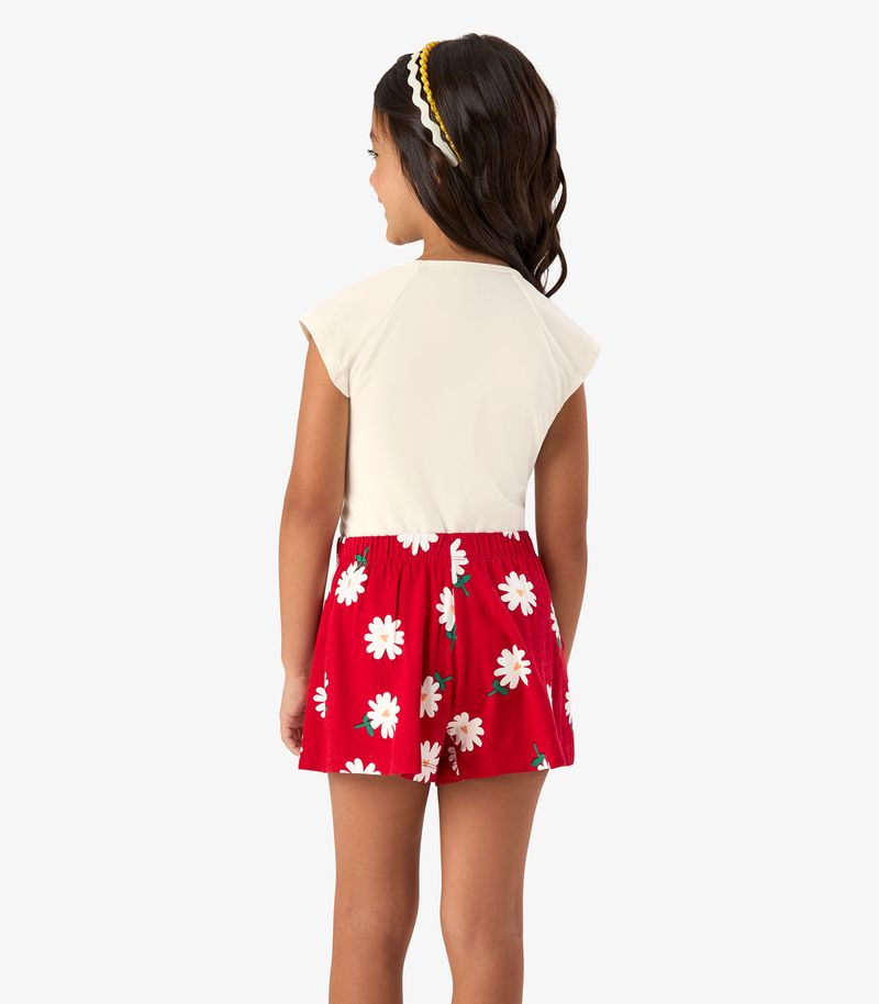 Conjunto infantil composto por blusa e shorts, confeccionado em visco maquinetada. A blusa tem modelagem moderna com recorte nos ombros, estampa frontal com aplicação de lantejoulas e acabamento com bainha dupla. O shorts possui cós com elástico embutido para melhor ajuste e estampa rotativa por toda a peça, além de barra com acabamento reforçado. Leve, fresquinho e ideal para os dias quentes com muito estilo.