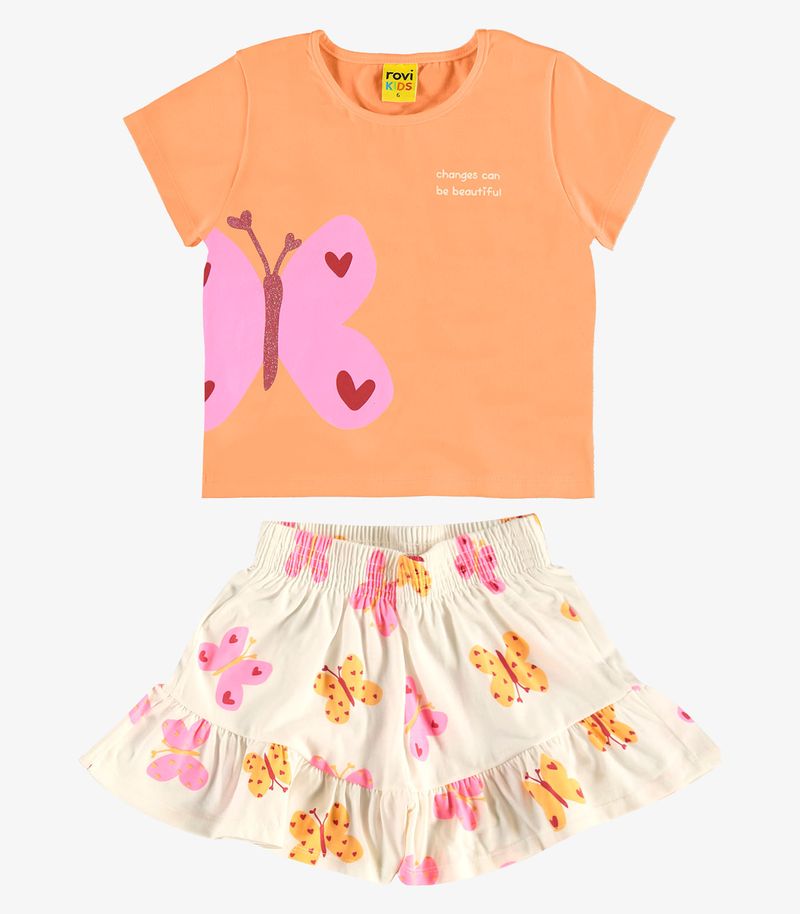 Conjunto infantil composto por blusa e short em cotton leve, ideal para os dias mais quentes. A blusa é feita em meia malha, com estampa localizada de borboleta na frente, acabamento de bainha com costura dupla, detalhe contrastante na gola e etiqueta nas costas. O short possui cós largo com elástico embutido para maior conforto, recorte franzido na barra e estampa rotativa de borboletas, trazendo charme e delicadeza ao look.