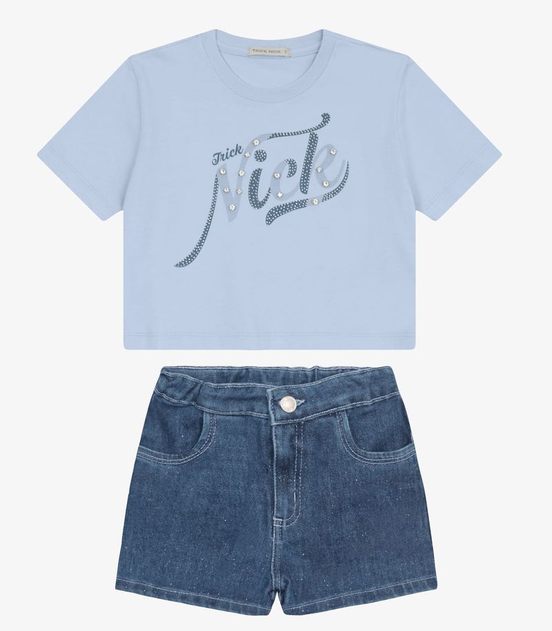 Conjunto Infantil Trick Nick confeccionado em Meia Malha e Jeans, leve e delicado. Possui estampa localizada com strass e rebite. A barra tem bainha fina que valoriza o caimento. Ideal para ocasiões especiais com muito estilo e conforto.
