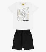 Conjunto infantil composto por camiseta e bermuda, confeccionado em meia malha moletom para maior conforto. A camiseta tem decote com acabamento FCB15B, estampa moderna de tênis e bainha com costura dupla nas mangas e barra. A bermuda conta com cós virado com elástico largo e acabamento reforçado com quatro agulhas, além de bainha com costura dupla. Ideal para garantir liberdade de movimento no dia a dia com muito estilo.