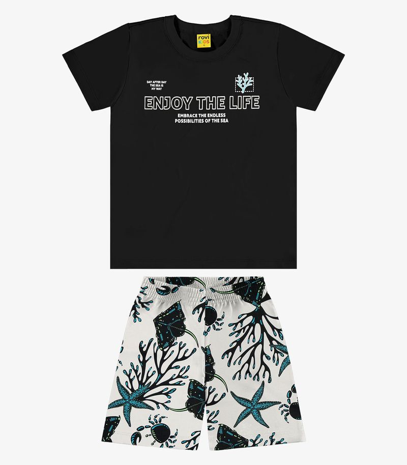 Conjunto Infantil Rovi Kids composto por camiseta em meia malha com estampa em relevo ¿Enjoy the Life¿ e detalhes tropicais, ideal para looks descontraídos e cheios de atitude. A bermuda é confeccionada em microfibra, com estampa de folhagens e temática do fundo do mar, leve e confortável para os dias mais quentes. Um conjunto que traz estilo, frescor e liberdade para as crianças curtirem o verão com muito conforto!