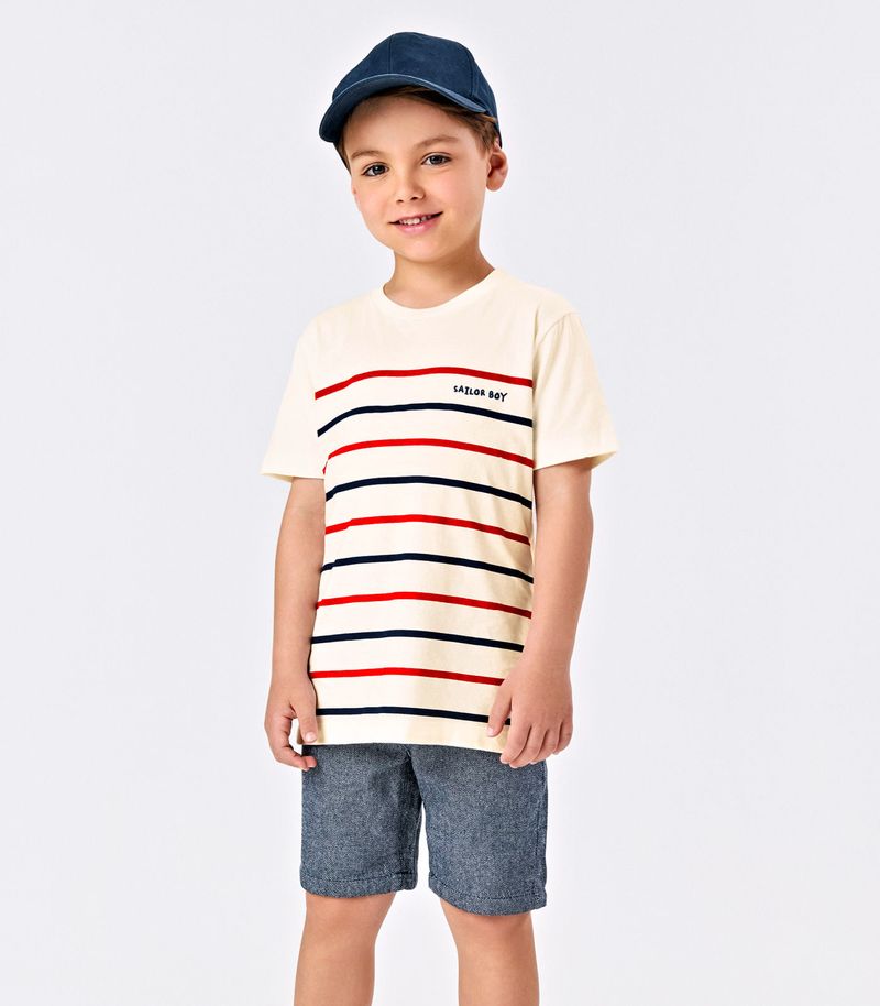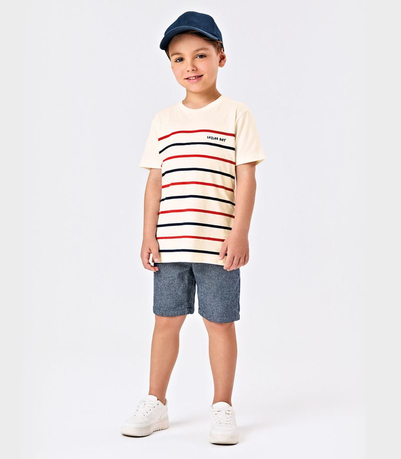 O Conjunto Infantil Camiseta com Bermuda Trick Nick é a escolha perfeita para um look estiloso e confortável. A camiseta de manga curta, confeccionada em meia malha, apresenta uma moderna estampa de listras, garantindo um visual despojado. A bermuda, feita em tecido chambray twill, oferece um toque sofisticado e confortável, ideal para diversas ocasiões. Prático e versátil, esse conjunto proporciona liberdade de movimento e muito charme para o dia a dia dos pequenos.