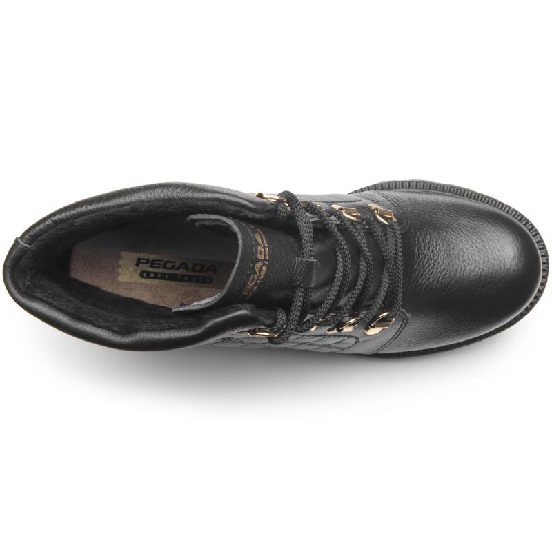 Esse coturno em couro preto é super estiloso. Desenvolvida com a Tecnologia SOFT TOUCH da Pegada, cada detalhe dessa bota foi pensado para proporcionar uma experiência de conforto supremo, desde a seleção da matéria-prima até os processos de produção. Os diferenciais são muitos, começando pelo forro em tecido atoalhado, que oferece um toque suave incomparável. A palmilha é macia. Já o solado é de Pu emborrachado, muito leve e flexível, com um saltinho tratorado de 7 cm, que ainda proporciona aderência ao chão para dar segurança ao caminhar.