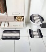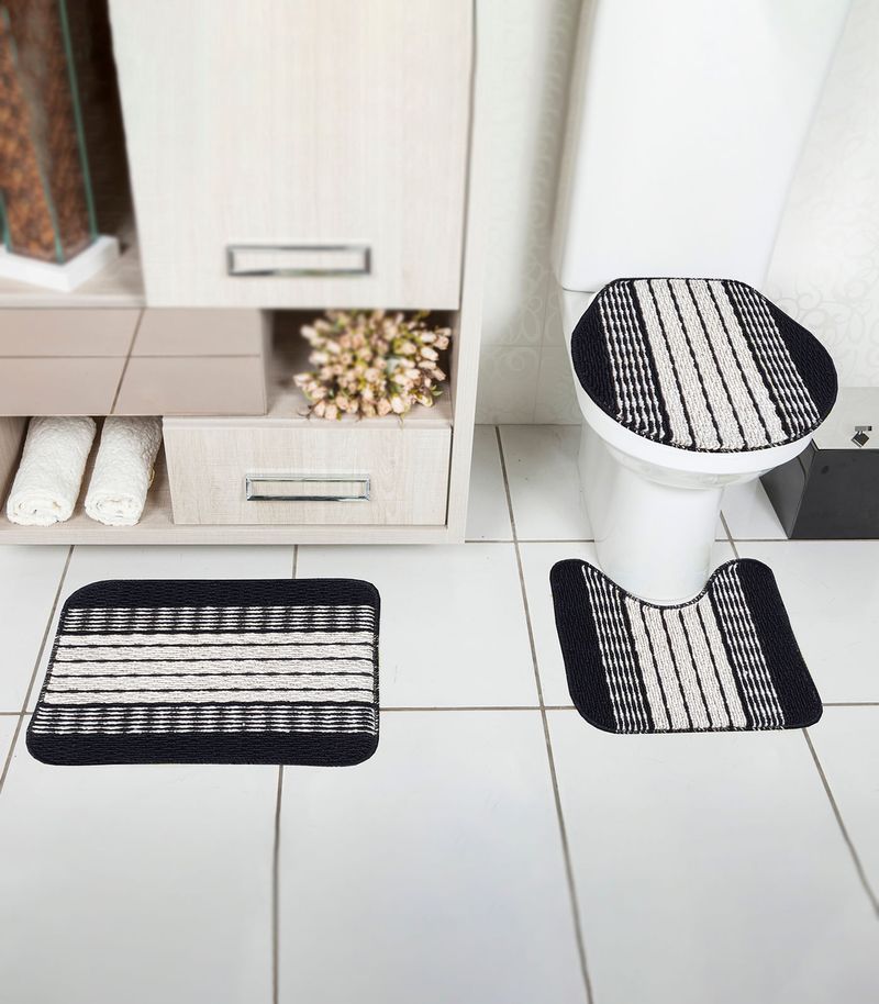 Jogo De Tapetes Composto por 3 peças: 1 tapete para pia, 1 tapete para vaso e 1 tapete para tampa do vaso sanitário confeccionado em polipropileno. Deixe Seu Banheiro Sempre Organizado e Charmoso.