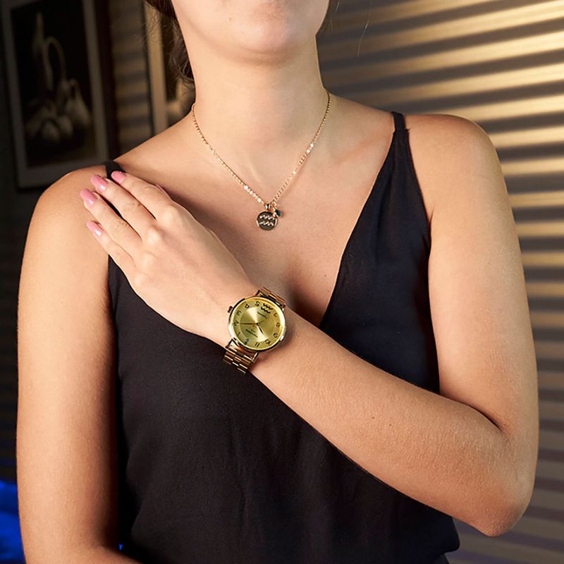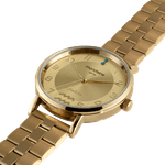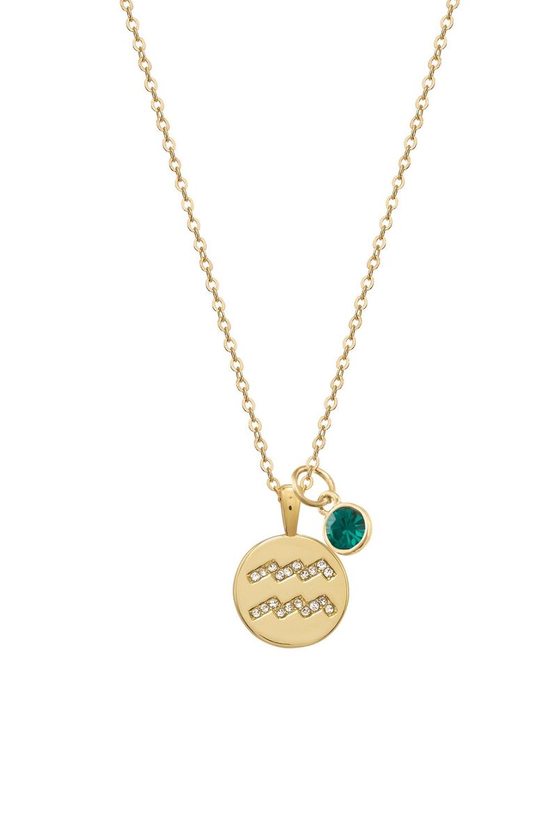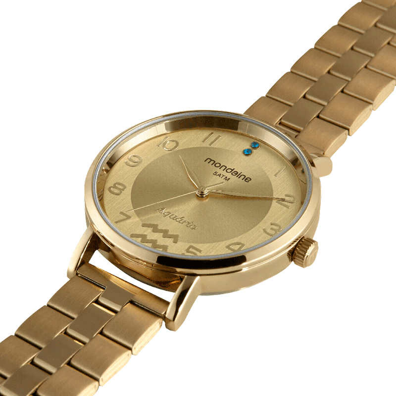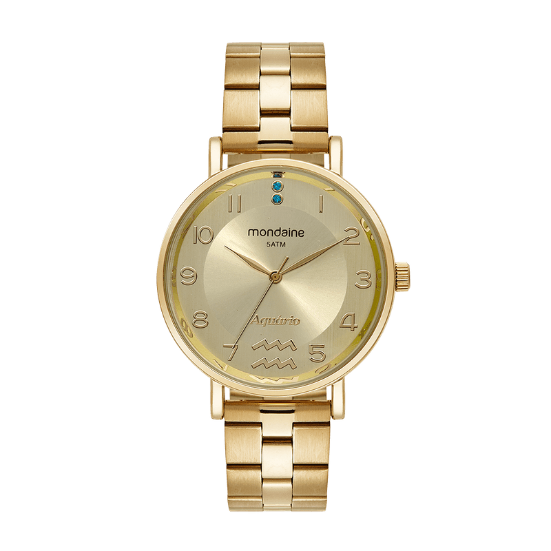 Kit relógio analógico com folheação dourada. Possui no mostrador o símbolo de Aquário além de ter um efeito em aço escovado, com brilho metálico e pedras da cor do signo na posição 12H. Acompanha um colar com pingente do signo em um estojo presenteável. Esse relógio possui a caixa em 4 cm de tamanho.
