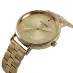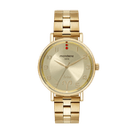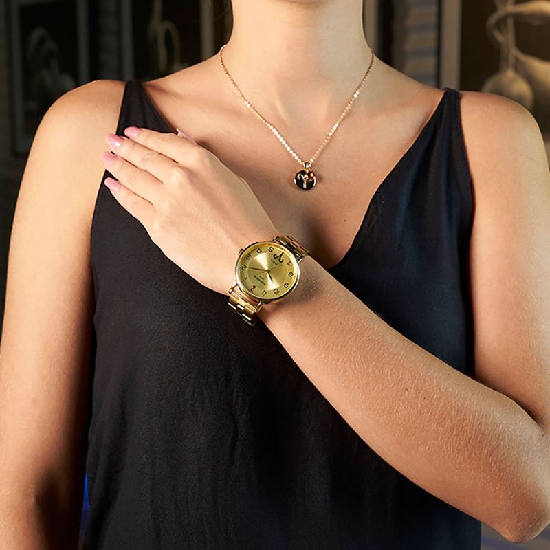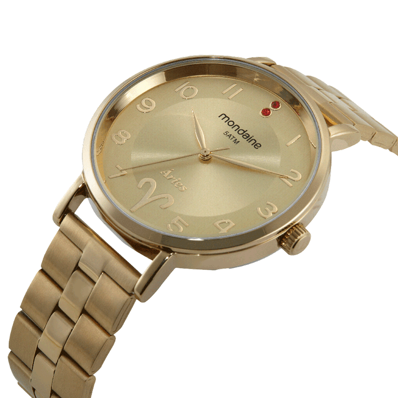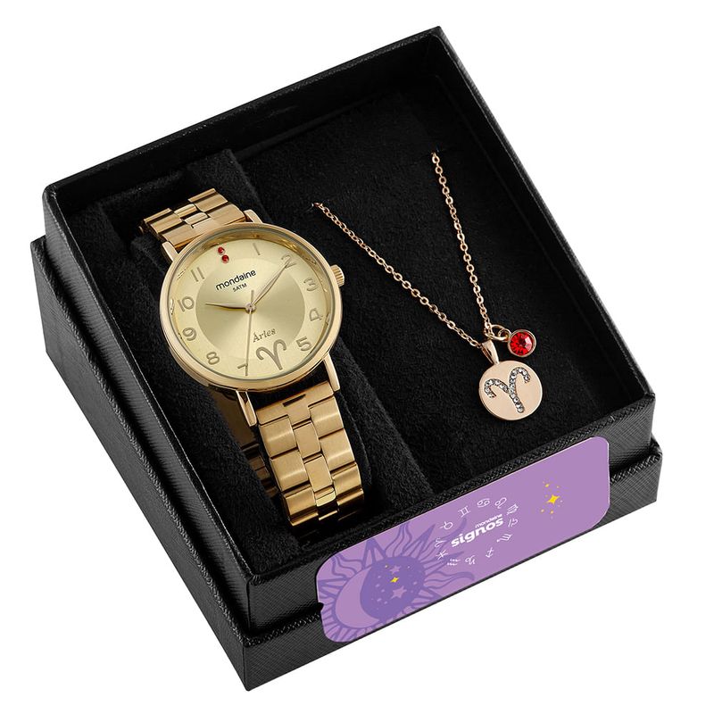 Kit relógio analógico com folheação dourada. Possui no mostrador o símbolo de Áries, além de ter um efeito em aço escovado, com brilho metálico e pedras da cor do signo na posição 12H. Acompanha um colar com pingente do signo em um estojo presenteável. O vermelho é a cor oficial que rege o signo de Áries e atrai autoconfiança, coragem e otimismo. Esse relógio possui a caixa em 4 cm de tamanho.