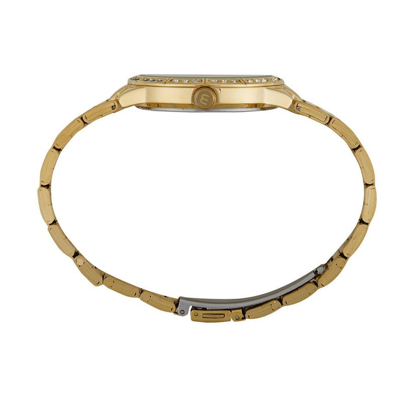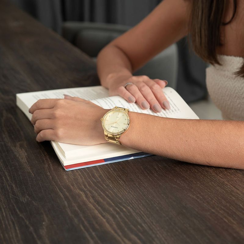 Este kit apresenta um relógio dourado mediano de 4 cm de diâmetro, com marcações em pedras e cristais na caixa, além de um mostrador com efeito espelhado. Para completar, acompanha uma elegante pulseira de pedras, tornando o conjunto uma escolha perfeita para quem busca estilo e charme em cada detalhe.