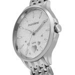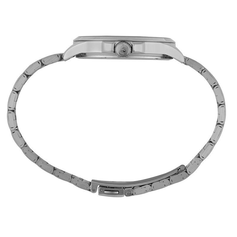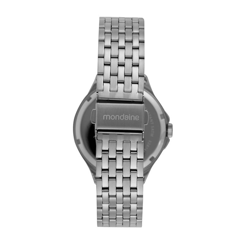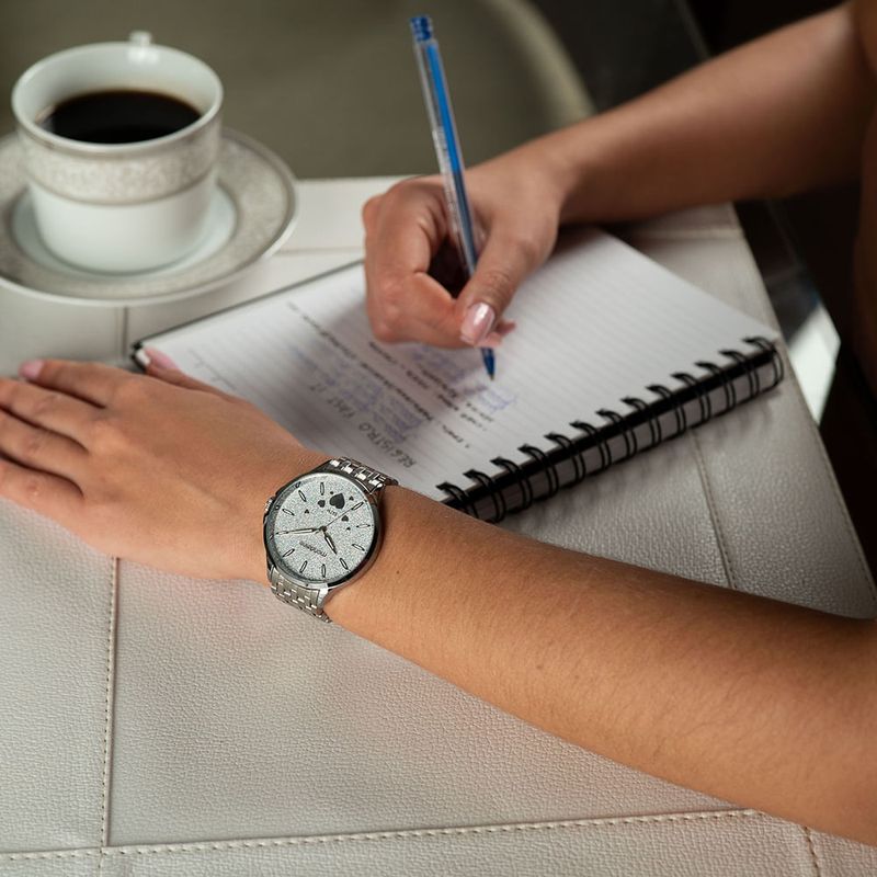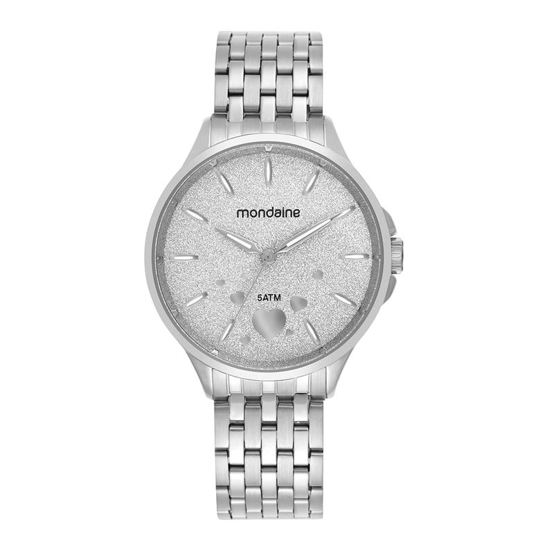 O relógio apresenta mostrador com efeito glitter, que se destaca com sua textura cintilante e acabamento prateado.