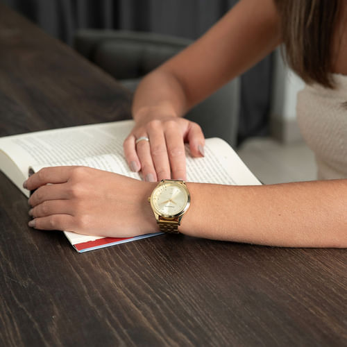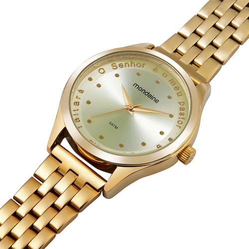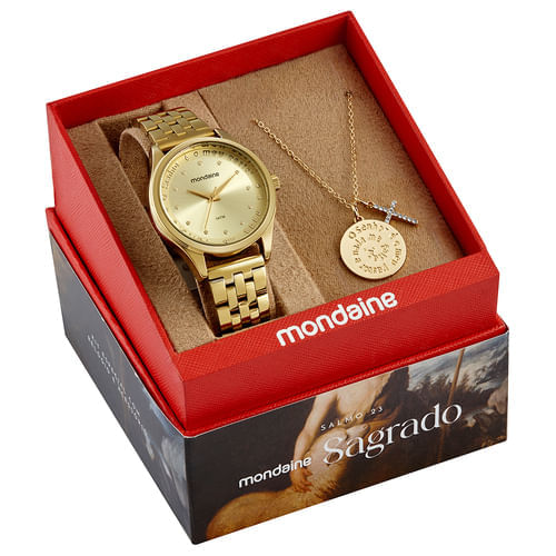 O kit relógio da coleção sagrado - Salmo 23 é uma expressão de fé e estilo. O relógio analógico apresenta a oração do Salmo 23 escrita diretamente no mostrador, tornando-o um símbolo de proteção e devoção. Com acabamento dourado, e caixa de metal de 3,8 cm de diâmetro, oferece um ajuste perfeito ao pulso. A pulseira, trabalhada em gomos polidos de aço, garante resistência e sofisticação. O kit inclui ainda um colar com a oração gravada na medalha e uma cruz decorada com cristais cravejados, ideal para quem busca um presente especial ou uma peça cheia de significado.