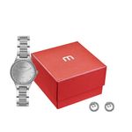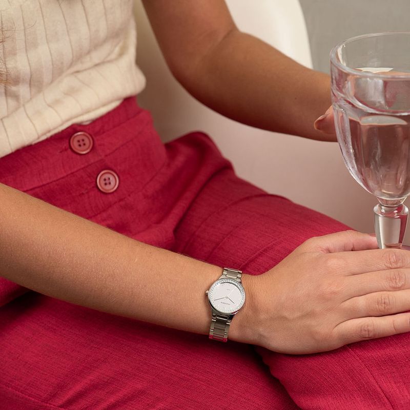 Este kit é composto por um elegante relógio prateado com caixa delicada de 2,8 cm de diâmetro. Seu mostrador espelhado traz um visual moderno, enquanto os cristais no interior do vidro adicionam um toque de brilho. A numeração completa garante fácil leitura, unindo funcionalidade e estilo. Para complementar, o kit acompanha um brinco cravejado com cristais, perfeito para realçar qualquer look com charme e elegância.