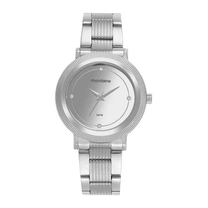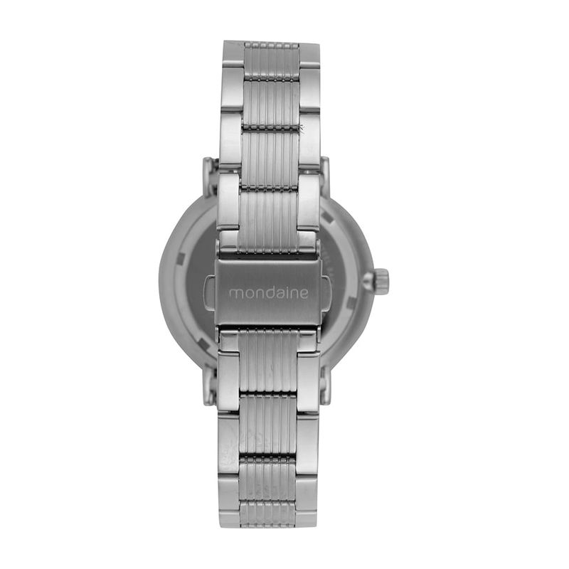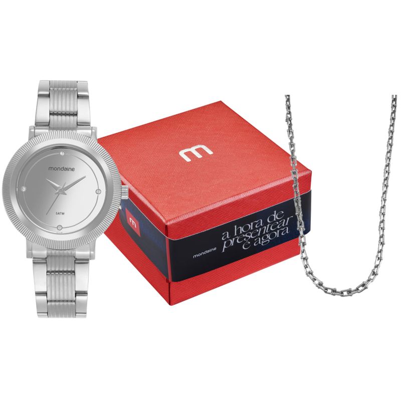 Kit relógio feminino Mondaine, um conjunto cheio de charme, ideal para para adicionar um toque de elegância ao seu dia a dia. O relógio possui uma caixa de 38 mm em metal cromado com acabamento serrilhado, que confere textura e estilo ao design. O mostrador espelhado é complementado com cristais na marcação, proporcionando um brilho sutil e refinado.